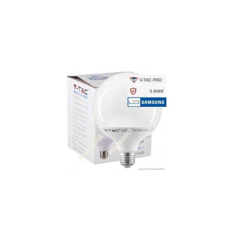 Lampadina LED V-Tac PRO VT-288 con potenza di 18W e attacco E27. Lampadina con tecnologia LED SMD con chip Samsung, forma Globo G120 in materiale termoplastico e copertura opaca. Fascio luminoso di 200° e flusso luminoso di 2000 lm. Questa lampadina ad alta luminosità ha rapporto di 111 lm/W. La potenza di 18W è equivalente a 124W di una lampadina a incandescenza.