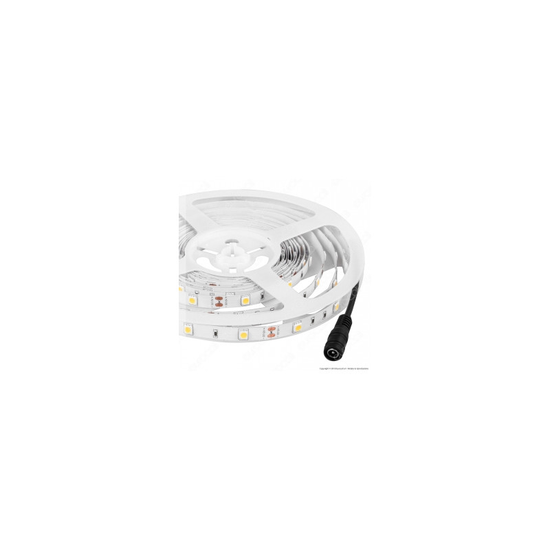 Striscia LED V-Tac VT-5050 con LED 5050 con potenza di 24W. La striscia misura 5 metri ed è composta da 30 LED per metro. Il fascio luminoso è di 120° mentre il flusso luminoso è di 16 lm per LED. Tramite il connettore Jack 2.1 può essere facilmente connessa ad un alimentatore plug&play. Divisibile e dotata di striscia adesiva sul retro.
